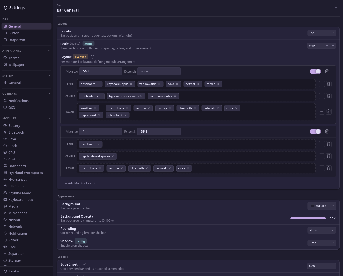 Settings can be edited in config.toml, through the wayle-settings GUI, or with the wayle config CLI. All three surfaces provided hot reloaded updates, reflected in the shell immediately.